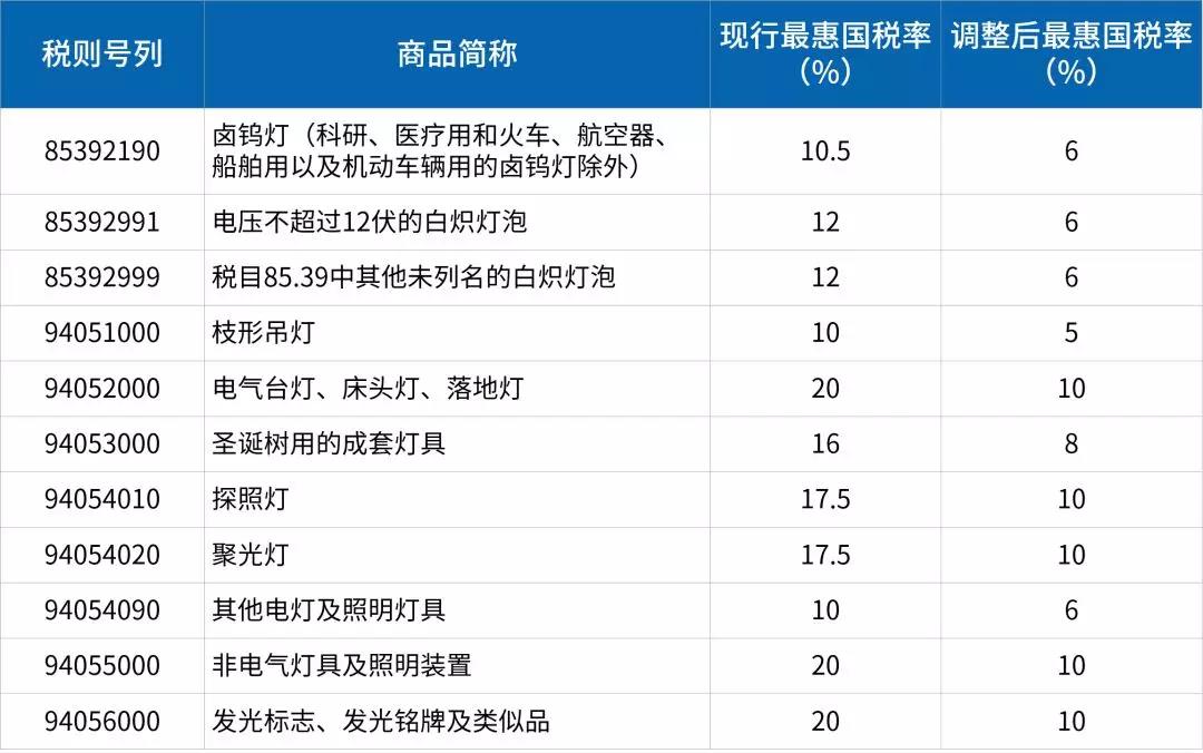 本次進(jìn)口關(guān)稅調(diào)整包括11類(lèi)照明電器產(chǎn)品,平均下降幅度在50%左右。具體如下表所示: